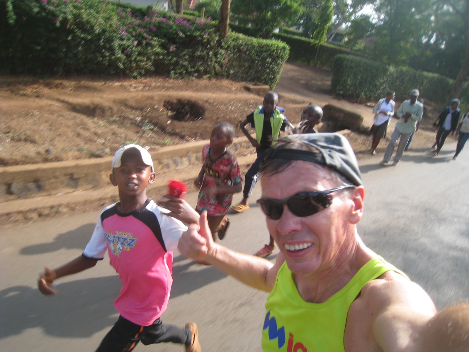 The first half is pretty much out and back on the main road. The joy is watching a flock (what else do you call them?) of African elite runners coming back together towards you. One second, then woosh, they are gone ... Watching these guys and girls is something I never tire of.